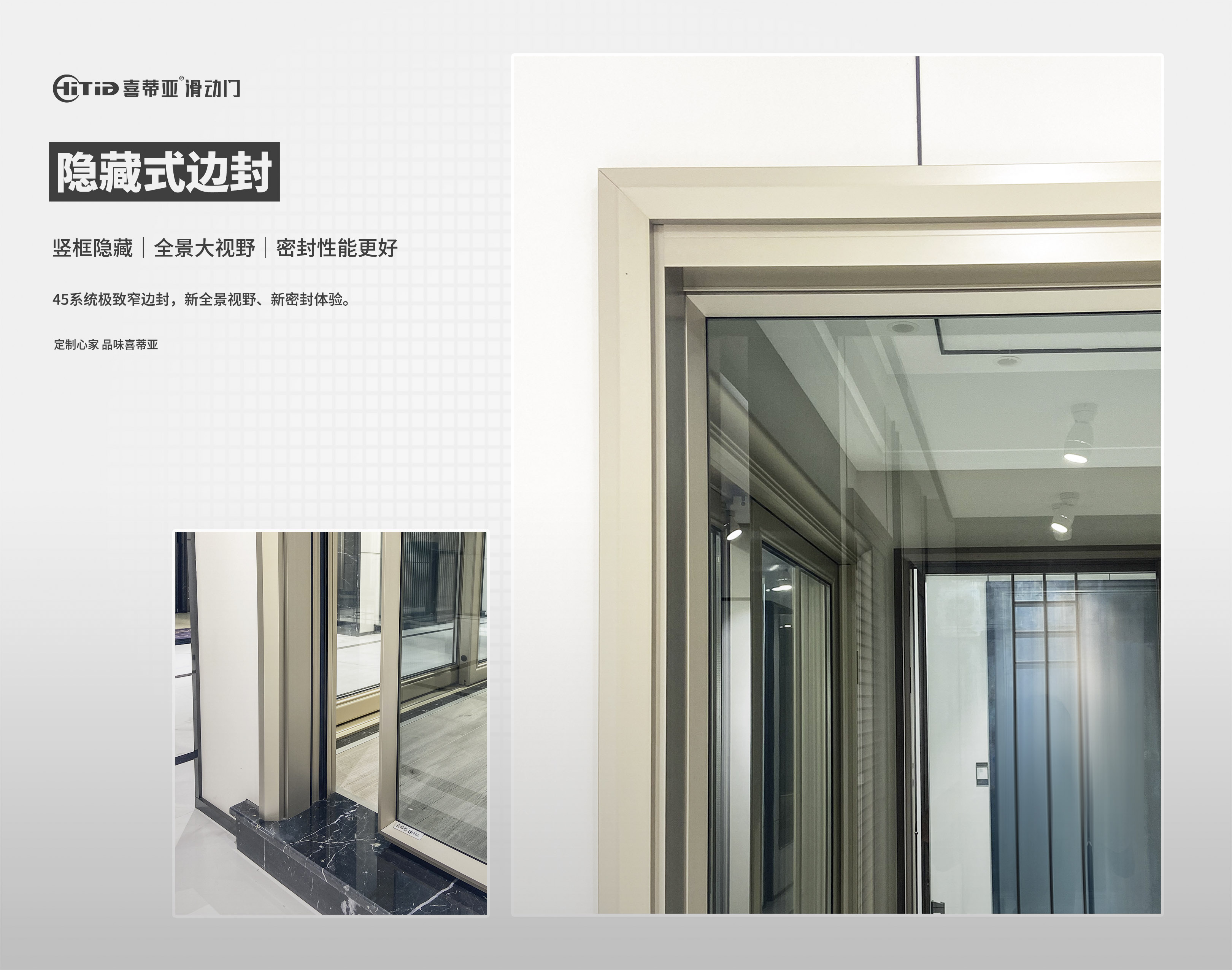 边封为全隐藏式设计,7mm极窄竖框完全藏入边封内,在关门时可以获得更大视野,同时也提升了门的密封性能。