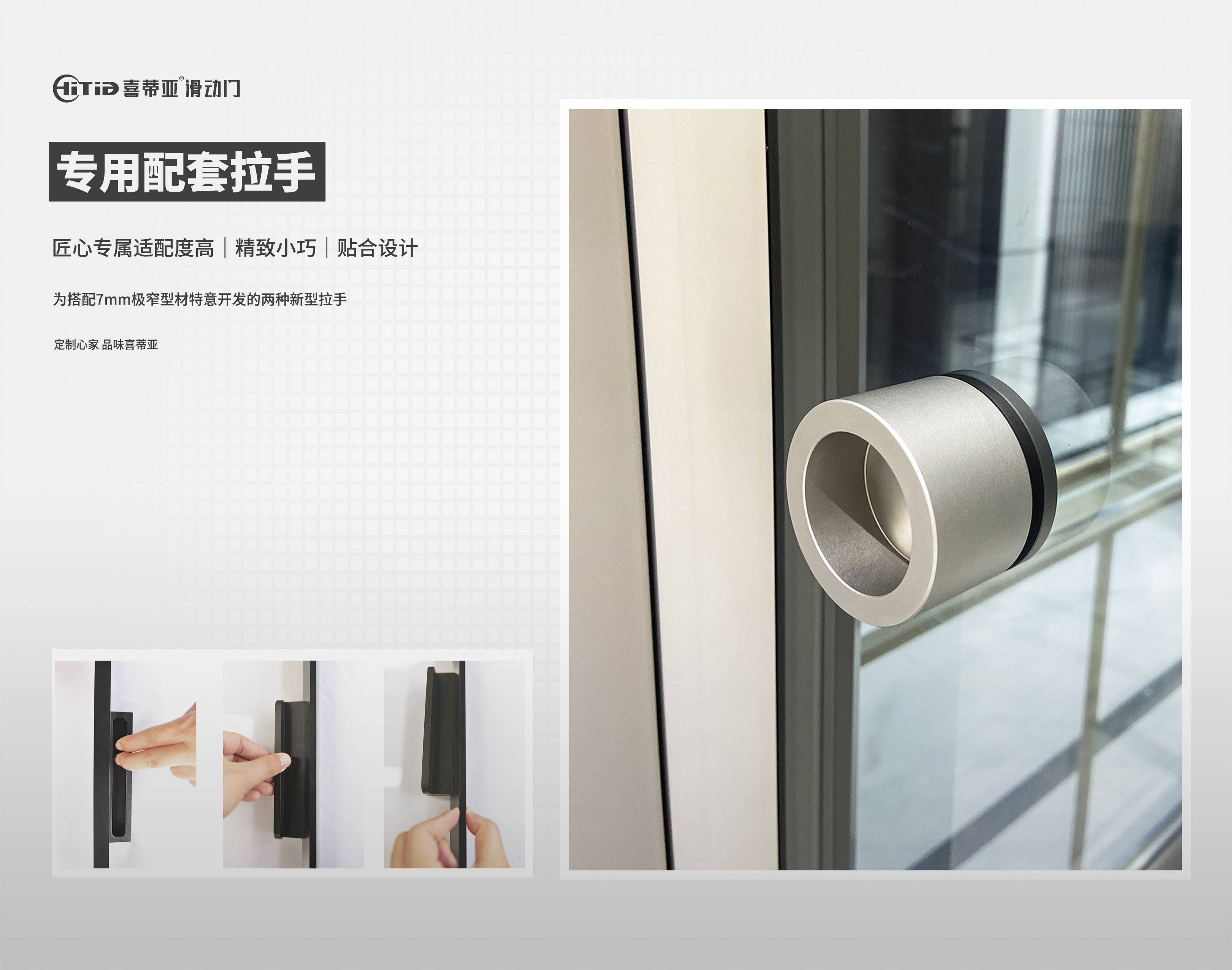 专用拉手分两种,一种是跟竖框结合在一起的长拉手,一种是通过玻璃打孔安装的圆拉手。两种拉手均是专为7mm极窄型材定制开发的款式。